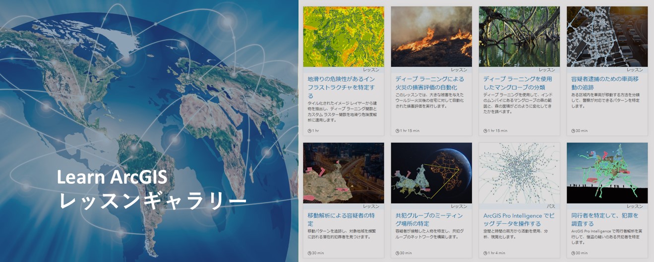 Esri が提供している自主学習用コンテンツサイトです。実践的なテーマをもとにした課題解決型の学習コンテンツ (レッスン) を無償で受講いただけます。