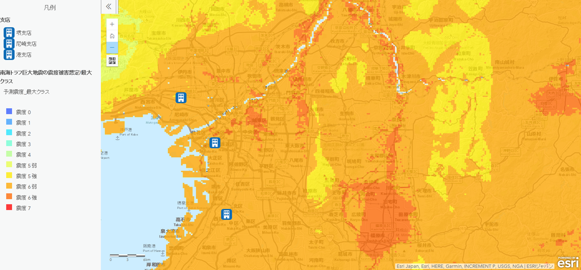 地震・津波・液状化・浸水・台風・土砂・噴火など自然災害リスクデータと自社拠点を重ね合わせ、被害想定を視覚化することができます。設備復旧のための人員確保、あるいは設備修理のための在庫パーツの配備など様々な被災復旧シーンを想定した対策を検討することができます。