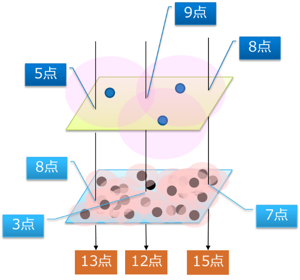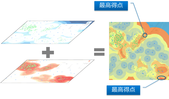 上図(右)では保育施設選定基準の2条件を組み合わせた最高得点地点=最適位置が、結果として2地点出現したことを表しています。この2地点を新しい保育施設の誘致場所とする際の、地理的な合理的根拠(エビデンス)が得られたと言えます。