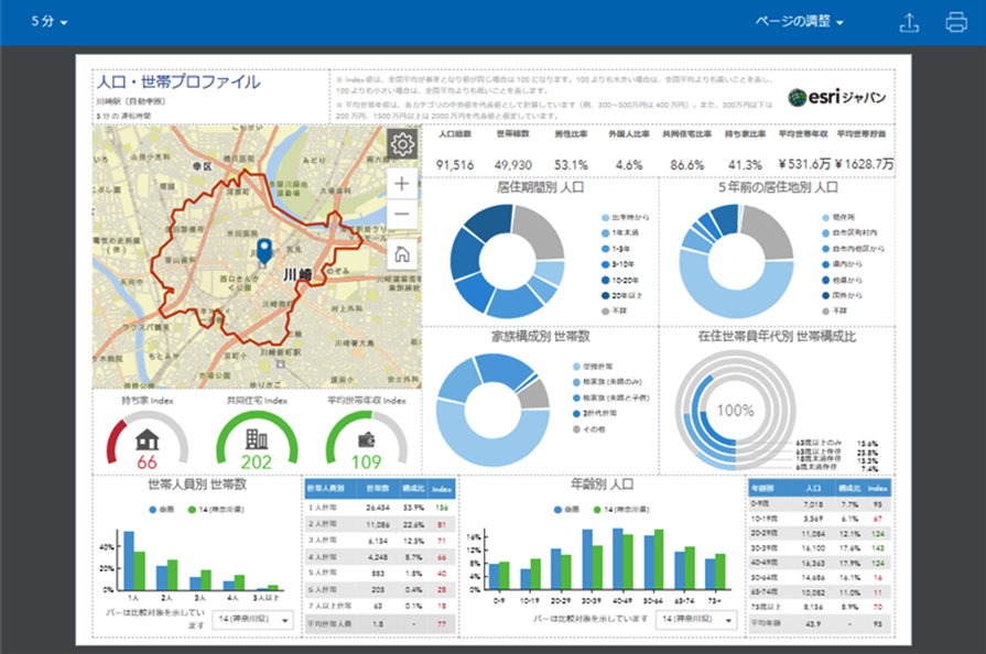 ArcGIS Business Analyst では、それらのデータを地図プラットフォーム上に管理するだけでなく、特性がより見えてくるように加工するための分析用のツールが幅広く用意されています。また、レポートやダッシュボードのテンプレートも含まれており、簡単な操作で店舗ごとの現状を把握するレポートやダッシュボードの構築が可能です。