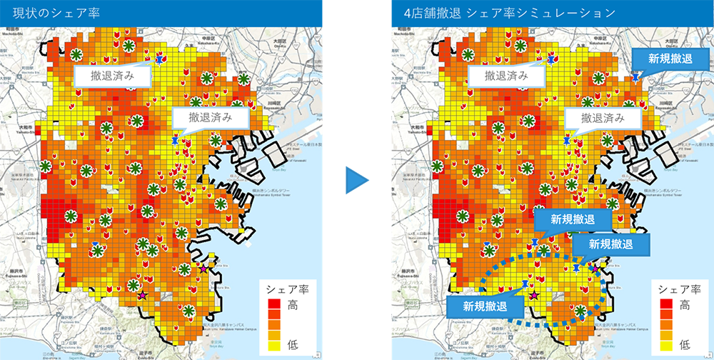 なお、このシミュレーション方法は、今回の記事のような戦略的撤退だけでなく、店舗網を広げる際にどこに配置するのが最適かという場面でも活用可能です。また、エリアマーケティング以外の業務として、商品を保管する倉庫網をはじめとした物流拠点の効率化にも、活用できるソリューションです。