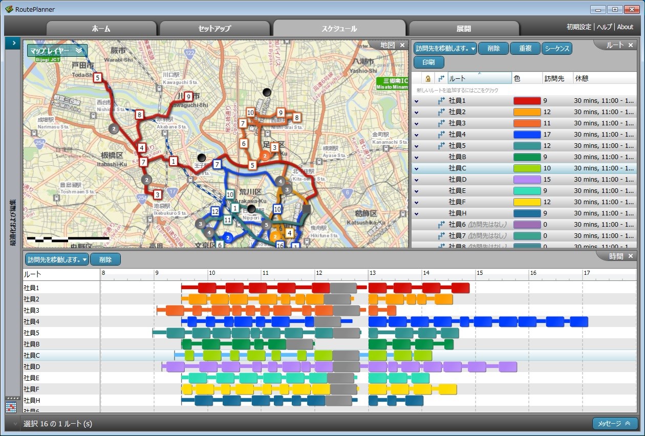 ルート設定のシミュレーションを行うことにより最適ルートが構築されますが、現実的には配送順を入れ替えたり、配送担当者を変更したりなどの調整が必要になるケースがあります。そのような場合、訪問先の到着予定時刻や滞在時間などをガントチャートで整理することで、業務量の偏りを俯瞰することができ調整業務が容易になります。さらに、地図上で現状のルートを表示させることにより、地理的に近い担当者で調整を行うなどが可能になり、より効果的なルート構築を行うことができます。