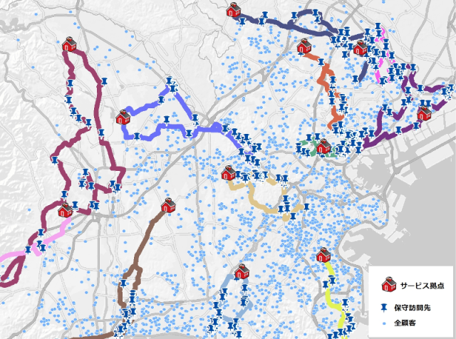 上記の地図は、各保守・サービス拠点を起点とし、メンテナンス対象の機器が設置されている顧客先を効率的に巡回するルートをシミュレーションした結果のイメージです。複数拠点のルートを一度にシミュレーションできること、さらには、各拠点の管轄エリア内を極力巡回する等の制約条件を設定できることで、業務の実態に即したルートを設定することにつながります。