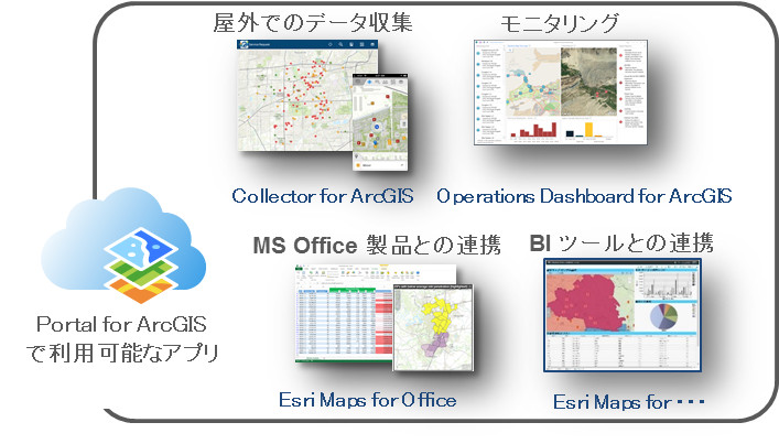 ポータルの製品にはお客様の業務を支援するアプリケーションがバンドルされています。モバイルを活用した屋外での情報収集、ダッシュボードアプリでのモニタリング、MS Office製品との連携、カスタムアプリ作成のビルダーなどこれらのアプリケーションを活用すれば、様々なシーン・業務に地図活用を適用することができます。地図活用の幅を拡げることにより、自社データの更なる活用、新たな発見、業務の効率化などを実現することができます。