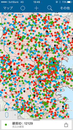 顧客訪問後のヒアリング情報顧客獲得時のステータス更新などをモバイルから入力し、顧客情報を地図にアップロードしすることができます。 また、担当エリアの地域の気づき(例:マンションや住宅の建設など)を入力すれば、新しい顧客発掘の機会創出やデータからは読み取れない新たな洞察を得ることができます。 顧客と地域の情報を収集することにより、地域力を強化することができます。