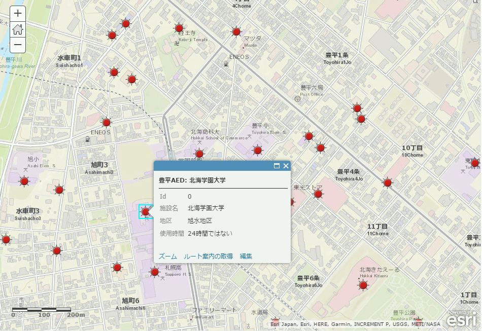 また、同学のマチブラ部では大学周辺の AED 配置図を ArcGIS Online 上で Web マップ化した「とよひら AED マップ」を作成しており、学生活動においても ArcGIS が活用され始め、主体的な活動が活発化してきている。