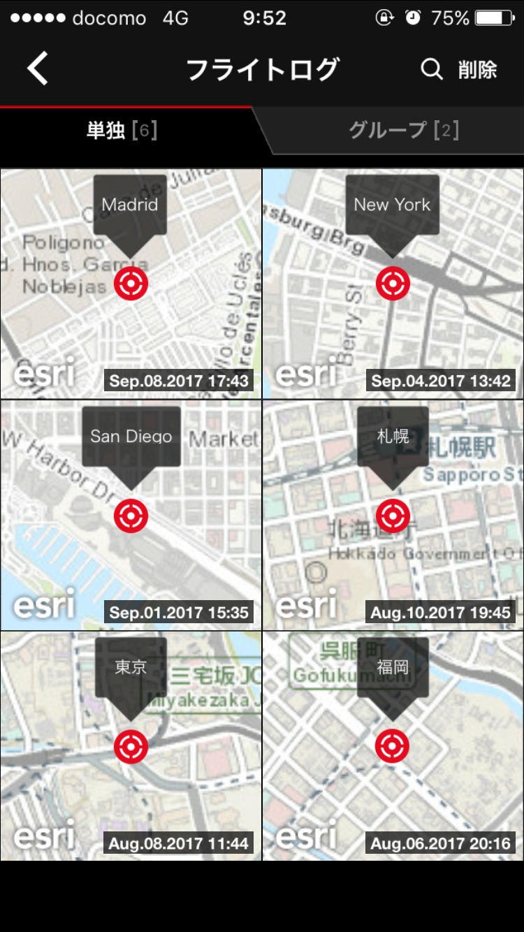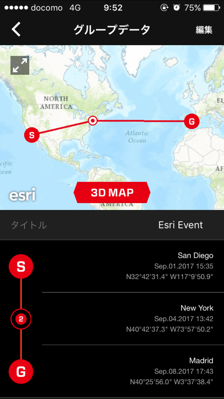 地図上にプロットされた各位置のデータは、単独でも閲覧できるが、グルーピングすることで移動履歴を一連の流れでトレースすることが可能である。履歴は地図とリストで確認できるのはもちろん、3D マップ上でアニメーション表示することができ、まるで空を飛んでいるかのような演出で、自らの移動履歴を追うことができるのである。 これらの地図表現を実現するために選ばれたのが Esri だった。2D の背景図だけでなく、3D 表現のためのデータも ArcGIS Online より Esri が提供している。