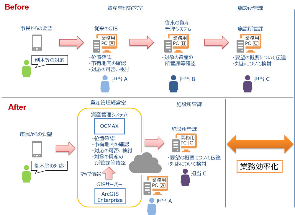 市が管理する施設や土地などの資産について、「木が倒れそうなので撤去してほしい」、「草が伸びているので処理してほしい」などの市民からの要望に対し、それらの場所や担当部署等を確認する必要があった。しかし、既存の資産管理システムと GIS は別々に運用されていたため、まず GIS によって住所から要望位置や市有地内であるかを把握し、次に既存の資産管理システムを使い担当課を特定し伝達する必要があった。さらに、既存の GIS はスタンドアロン型であり、利用できる職員と PC が限定されていたため、今後の継続性が懸念された。 また、社会インフラのメンテナンスの重要性や、インフラ維持・補修コストの増大と熟練技術者不足等に伴い、インフラ・メンテナンスの改革が求められていた。総務省から地方自治体に対して、公共施設等の総合的かつ計画的な管理を推進するために「公共施設等総合管理計画」の策定に取り組むよう要請が行われたことも新システム導入を検討する要因となった。 そこで、資産管理システムと GIS を統合することで対象施設等の位置を同一システム内のマップで可視化でき、複数の担当職員が各自の業務用 PC から利用できるシステムを検討し、株式会社オリエンタルコンサルタンツが開発したクラウドベースの OCMAX の導入を決めた。OCMAX は、地方自治体等の公共施設マネジメント業務の効率化に役立てられている。