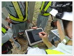 橋梁の各スパンで分割された上部工データ(ライン)および下部工データ(ポイント)を地図上に表現し、点検対象となる箇所をクリックすると橋梁の緒元が確認できる。その緒元と前回点検した結果を紐付け、点検結果属性、損傷写真、損傷点検図を現地で確認しながら点検結果の更新ができる。また、新規損傷を発見した場合でも予め準備した個別損傷図形を選択し、容易に損傷形状を追加できる。 橋梁詳細点検の一連作業を支援するツールとして、タブレット端末は効果的である。現地点検の前に必ず事前踏査を行い、大型車両の通行確認や待機位置、電線等の架空線有無確認などを把握する必要があるが、それらの情報を地図上にメモし、必要に応じて現場状況写真を記録することで、現地点検を効率的に支援することが可能となる。