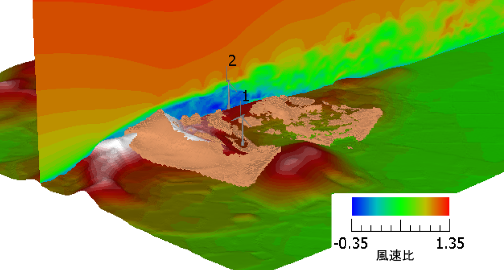 詳細な周辺地形は、無人航空機( UAV: Unmanned Aerial Vehicle 通称ドローン)で風車サイトを撮影し、それらを画像解析することで取得した。撮影は、対象範囲を格子状にくまなく自動的に飛行・撮影するための自動飛行プログラムを用いて、地上高約 75 m上空から連続的な真下撮影の手法で行った。使用したドローンは DJI 社製の Phantom4 である。 次に、ドローンで撮影した約 570 枚の画像群を 3 次元画像解析ソフト Drone2Map for ArcGIS で処理し、(1) 地形標高データと (2) 樹木や地上構造物の高さデータの 2 種類に分離し、メッシュデータ(水平空間解像度 1m )として出力した。 作成した 3 次元詳細地形データを入力データとし、数値風況診断技術「 RIAM-COMPACT 」を用いて、東南東の風の流れをスーパーコンピューター( NEC 製の SX-ACE )で計算することで、局地的・局所的な風の流れの時間的・空間的な変動を可視化した。図 3 は、風車を通る鉛直断面内の主流方向 (x) の風速分布を示す。風車は、そのすぐ上流に位置する標高 125m の小地形からの剥離流(地形性乱流)の影響を強く受けている様子が確認できる。特に、風車ハブ中心(地上高 78m )から地面において風速は時間とともに激しく変動していることが明らかになった。風車立地点における風速の鉛直分布は流入風速分布から著しく逸脱した上、さらに大きく歪んでおり、結果として極端な速度シアが多数発生していることが示された。