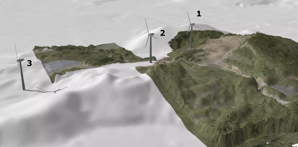 一般的に、風車の発電量は、鉛直上方に向けて徐々に風速が増加していく「ベキ法則」に沿った風が風車ブレードに流入することを前提に設計されている。よって、ベキ法則から大きく逸脱した今回のシミュレーション結果からは、発電電力量の大幅な低下が予想され、同時に極端に大きな速度シアはヨーモータやヨーギアなどの故障にも直結しているとされる。実際の風車においても、東南東の風が発生した場合、ヨー制御の多頻度動作によるヨーモータのブレーキパッド損耗および遊星ギヤーの破断(金属疲労と推定)と、ピッチ制御の多頻度動作による油圧操作系の故障が多数確認されている。 ドローンおよび Drone2Map for ArcGIS を用いた 3 次元地形データは、地形図からは取得できない実際の形状を取得するため、非常に信頼性の高いシミュレーションが実現した。加えて、Drone2Map for ArcGIS で出力される 3D 成果物は、ArcGIS Pro を用いて 3 次元的にプレゼンテーションが可能である。ドローンによる風車視点の映像などと合わせて見ることで、地形形状と乱流発生のメカニズムを専門家以外の方と共有できる有用なコミュニケーション手段として活用できることが分かった。