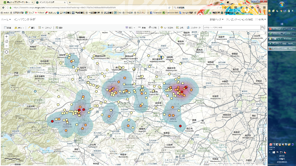 多摩信用金庫では、自治体などから受託した事業の調査結果を GIS で分析、可視化し提供している。広域的な視点での分析が重要であるとの観点から、分析結果を表した地図は多摩地域周辺の自治体を含めた内容になっている。以下に実際の例を紹介する。