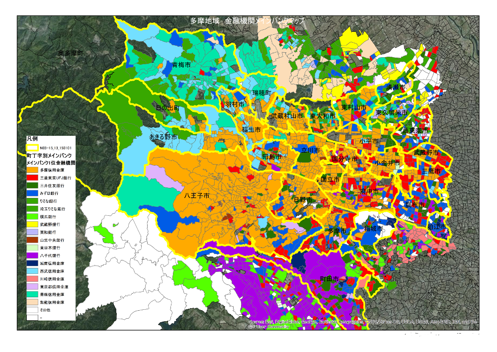 このように、ArcGIS Business Analyst で作成した地図は、受託調査における調査内容の可視化や分析、地域の経済団体や経営者の会合での講演資料として利用している。地図を織り交ぜることで広域的な観点から課題や現状を伝えることに役立っている。 経営戦略の立案支援においては、新規出店や市場調査、競合分析に活用している。 図 3 は、多摩地域に拠点を置く企業がどの金融機関をメインバンクとしているか多摩地域の市町村界と重ね合わせて可視化したものである。 同金庫と他の金融機関のシェア状況を可視化、分析し、各営業店に還元することで営業戦略に活かしている。 新規出店を検討する場合は、競合となる金融機関と見込まれるシェアがどの位になるのか分析、検討を行う際に ArcGIS Business Analyst を活用している。