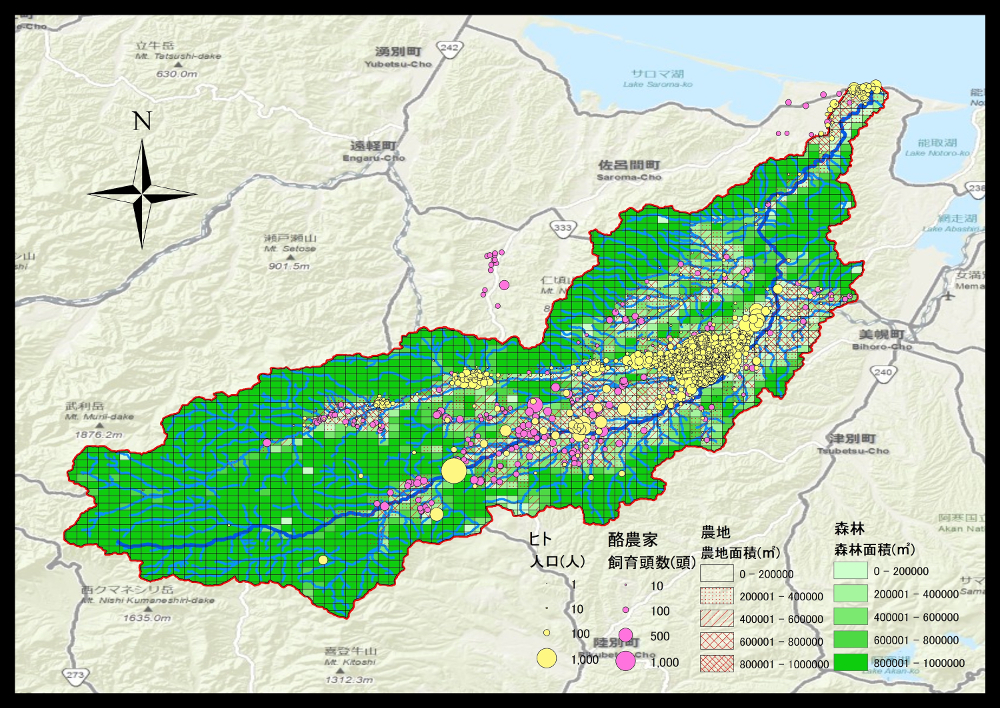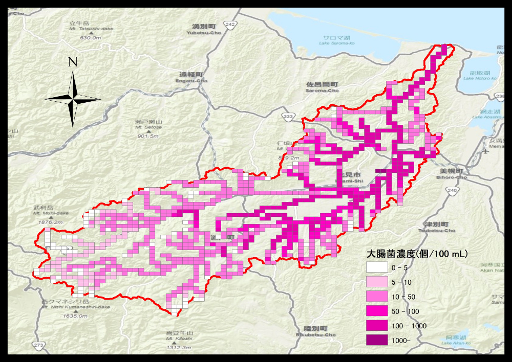 マテリアル工学科の宇都准教授の研究室では、博士課程の工藤氏が中心となり、北見地方を流れる常呂川において検出される大腸菌の汚濁源を解析する研究に ArcGIS が使われている。研究では、大腸菌の主要な発生源を野生動物、家畜、畑地(堆肥)、都市部のヒトの活動として、常呂川水系のメッシュ毎に大腸菌の負荷量を推計している。メッシュ別の情報元として、国土数値情報の土地利用 3 次メッシュ(森林、農用地、建物用地)、並びに河川データ、また政府統計の国勢調査と農林業センサスから地域別の人口や家畜の飼養頭数に関するデータを入手した。 大腸菌の汚濁源から常呂川へ流出を計算するモデルは、産総研が開発した化学物質の暴露評価と対策評価に利用される AIST-SHANEL を利用した。ArcGIS は、分散していた情報の管理と集約、さらには AIST-SHANEL の解析結果を地図上に表示するところで利用している。 本研究により汚濁に強く影響する地点や天候などの解明、さらには自治体での適切な対策に活かされることが期待されている。