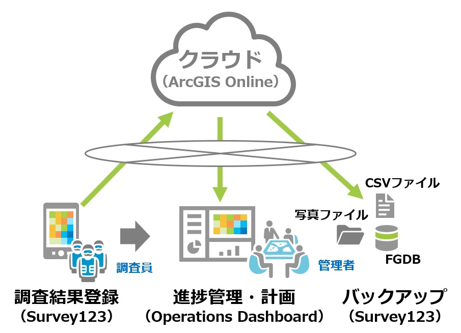 クラウド GIS である ArcGIS Online を利用する事により、導入決定から 2 日後には調査システムを構築する事ができた。