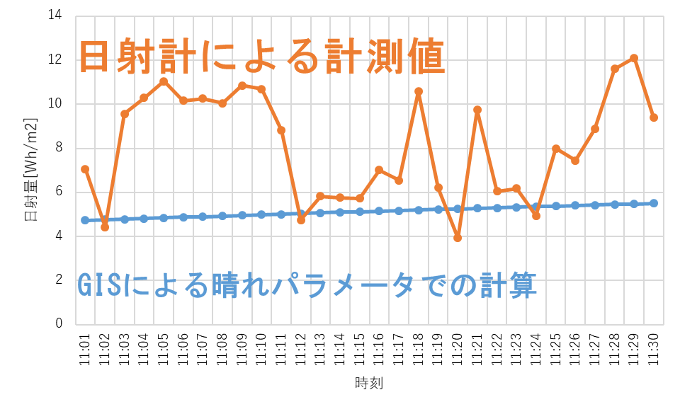 そのために、全方位カメラを利用した全天画像解析による雲の影響を考慮した日射量解析を構築した。GIS 日射量解析値と実測値には図 1 のように差がある。