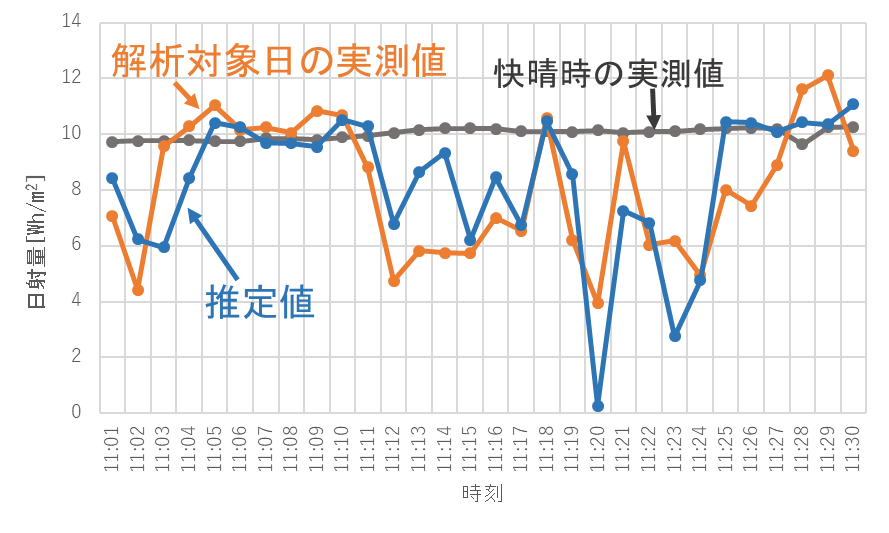 全天画像解析と GIS による日射量解析を組み合わせた日射量推定結果を図 5 に示す。太陽の周りに雲が存在する際に、反射により快晴時を超える日射量を観測することがある。この手法では、図 5 のようにその状況を表現できていることが分かる。