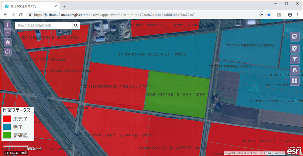 そこで、Web AppBuilder for ArcGIS を活用し、共通の属性情報を持つ圃場については、一括で現地調査の結果を反映できるアプリケーションを作成した。これにより、懸案事項を解消することに成功し導入に至った。