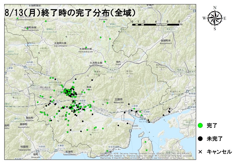 この作業により、全域の現況マップが毎日更新され、以降の支援先の選定等に活用された。また、この現況マップを都度掲示することで、認識共有を図ることができた。