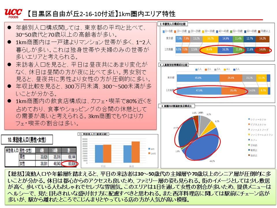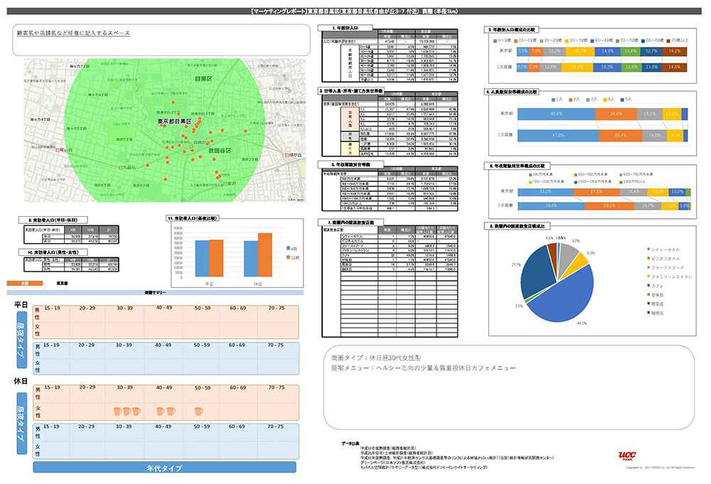 ソリューション営業が対象とする顧客は、個人経営の喫茶店からチェーン店までさまざまだが、それぞれの店舗に対し、データを基にした、メニューから店舗のデザインまでトータルな提案を行っている。具体的には、人口統計情報などを基に店舗周辺の商圏調査データを抽出し、さらに実際の店前通行量の調査データを加えて、その店舗のターゲットとなる客層を提示する。そのターゲットに適した業態や店舗のコンセプト、メニューの提案から、実際の食材手配・レシピ開発、店舗のオペレーションまでもカバーしているという。この業務に対応するため mapDISCOVERY には独自のカスタマイズが施され、