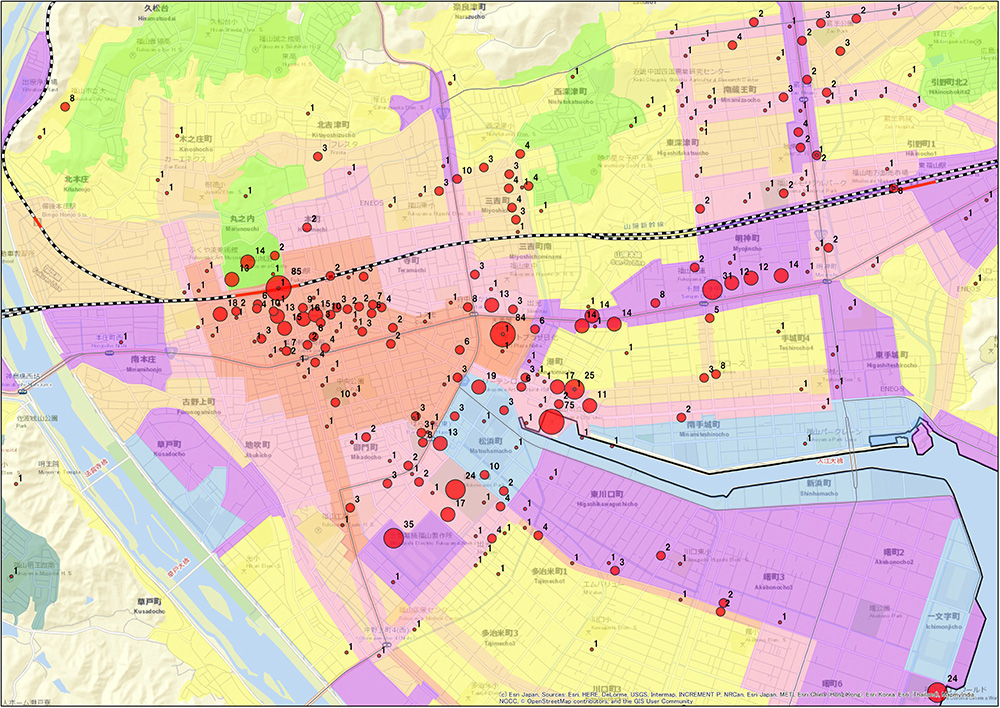 実際の演習では、福山市中心市街地の建物階数、1 階の用途、営業の有無等について履修生約 30 名が現地調査を行った。GIS で作成した地図を印刷し、エリアを分担し、中心市街地の土地や建物の現況を調査した。