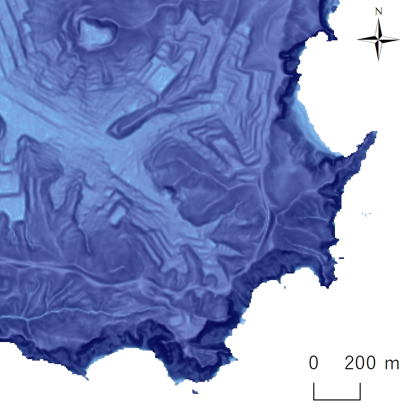 このモデルを実行すると、地貌図のベースとなる 2 種類のラスターデータが作成される。この 2 種類のラスターデータをそれぞれ指定のシンボル設定で表示することで、図 1、2 のような地貌図が作成される。必要な地形データの準備からシンボル設定を含むここまでの作業については、手順書(A4、1 ページ程度)を作成しており、その手順に沿って作業を進めることで、地貌図が完成するようになっている。