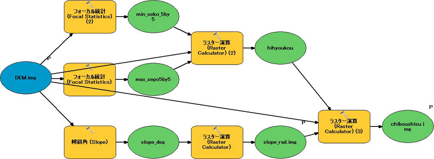 従来の地貌図作成方法における課題を解決し、誰でも簡単に地貌図を作成できる環境を整備することを目的に、ModelBuilder を用いた地貌図作成のためのモデルを構築した(図 3)。