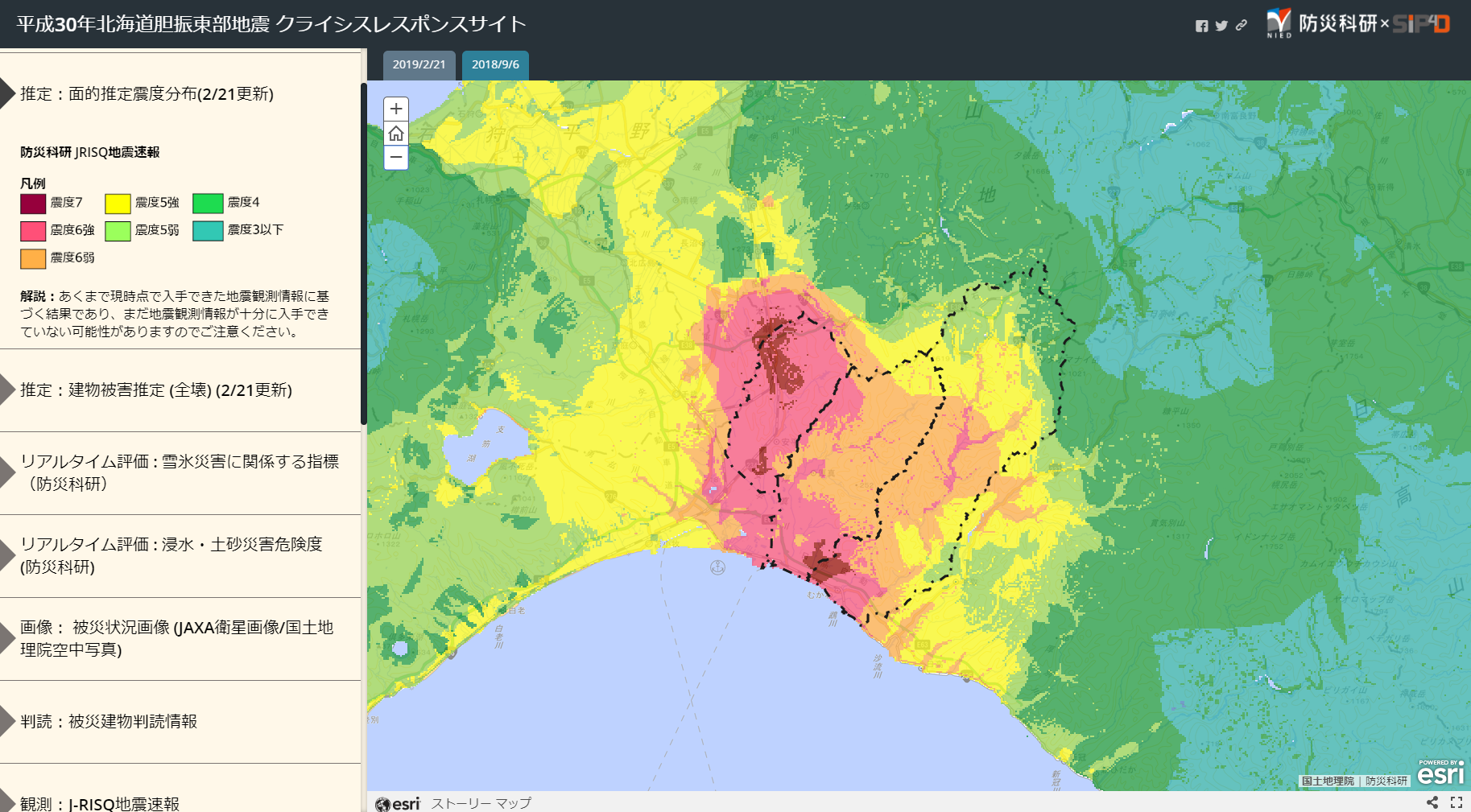NIED-CRS の役割の一つに様々な災害情報を地図に表現することが挙げられる。これまでは他の Web GIS アプリケーションを用いて公開してきたが、2017 年(平成 29 年)より ArcGIS Online をベースとしたサイトを公開している。