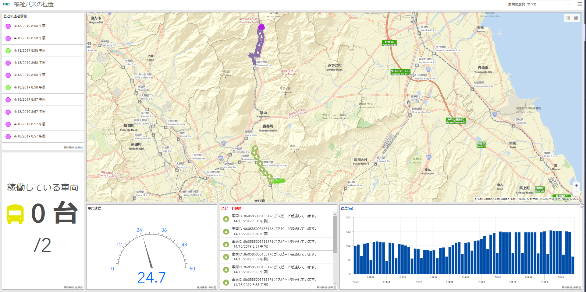 また、スクールバスの運行計画を受けて、2019 年にバスのリアルタイム動態把握の実証実験を行った。既に香春町で運行している福祉バスに SORACOM 社製の GPS デバイスを搭載し、ダッシュボード形式の Web アプリでリアルタイム監視を行った。将来的に町内を走る 12 台のスクールバスに搭載し、バスの位置をリアルタイムに取得し住民が閲覧できるアプリとして公開するサービスの展開をしたいと考えている。