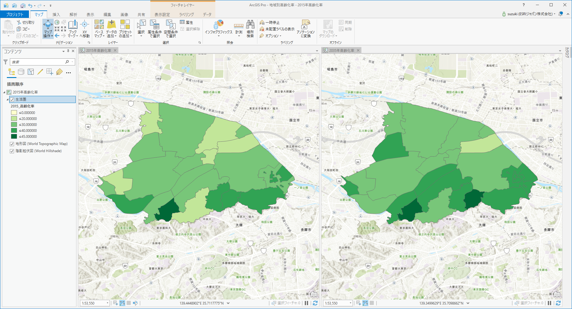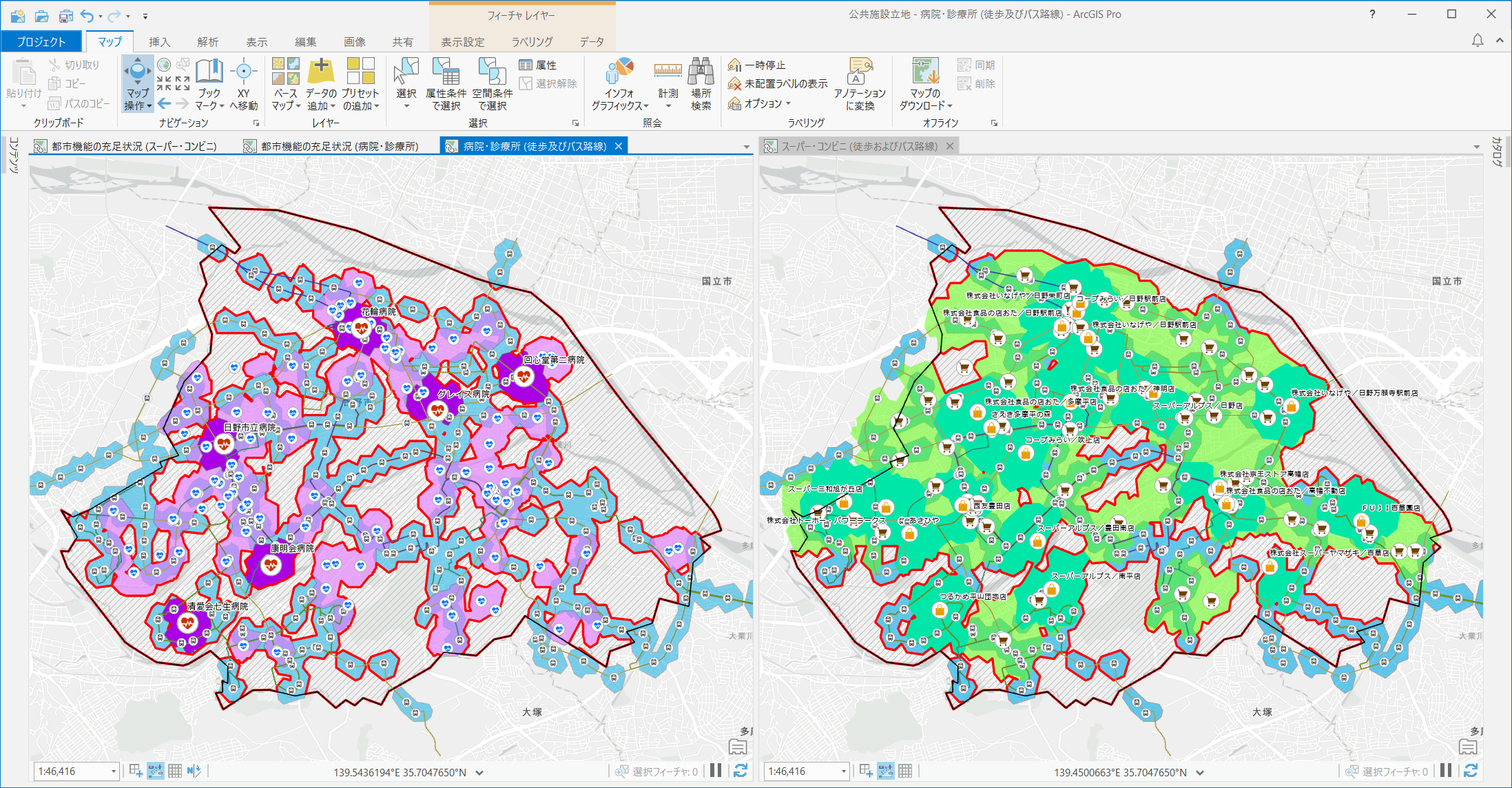 都市計画課においては、GIS とまちづくり施策の連携を模索しており、生活に必要な都市機能の立地状況の把握や地域課題に関して GIS を活用した可視化を行っている。現在実施している「立地適正化計画」の可視化やモニタリング(経年変化) に GIS の活用を図りながら、業務フローと処理フローも可視化し、ModelBuilder の機能を用いて可能な限り操作を自動化することで利活用しやすくしている。