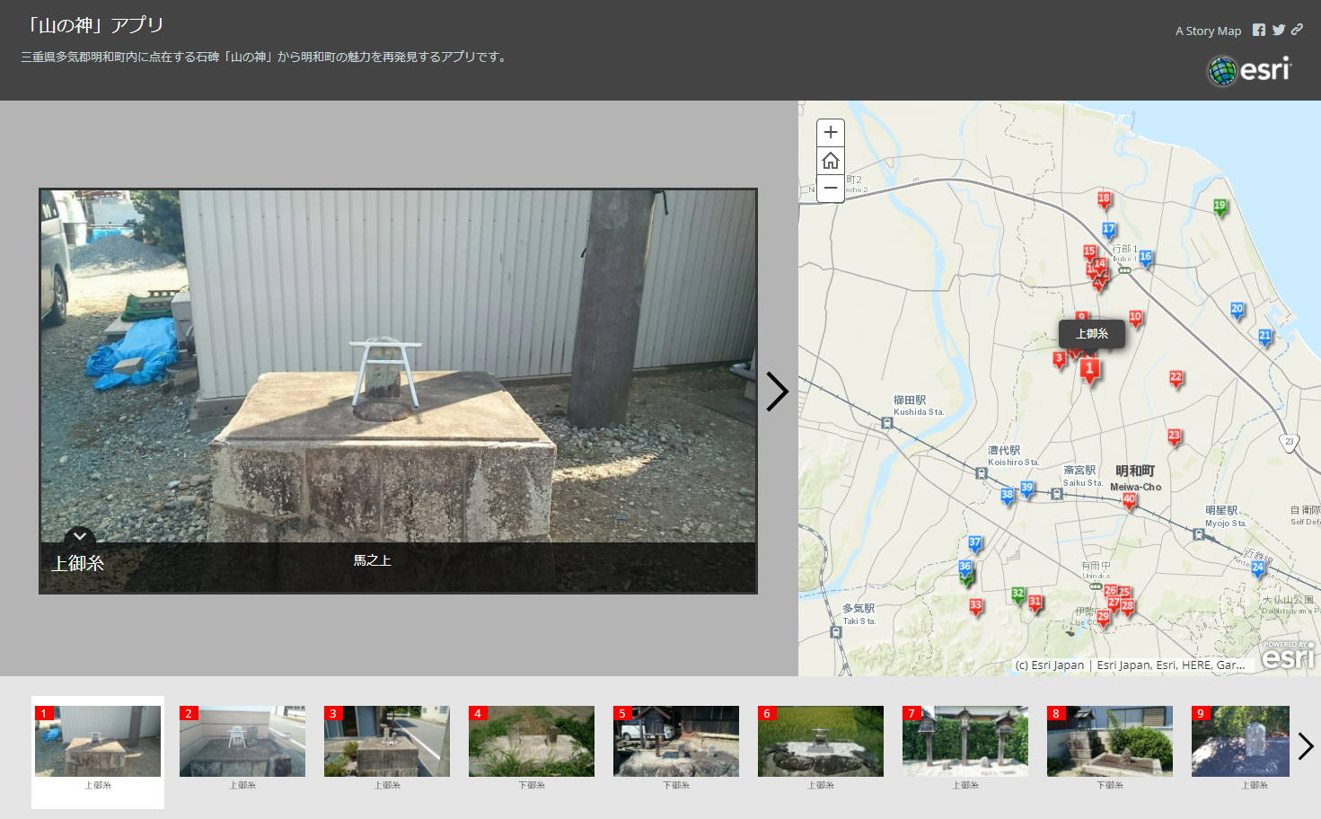 ArcGIS の導入以降、2017 年からは既存科目に GIS 教育を取り入れてきた。また、2018 年(平成 30 年)には、コミュニケーション学科の学生と桐村助教(当時)、教育開発推進センター(当時)の板井准教授(当時)が三重県明和町と協力して、町内の「山の神」と呼ばれる碑の GIS データを作成し、「「山の神」アプリ」として公開した。2020 年(令和 2 年)からは、文学部コミュニケーション学科で、(公社)日本地理学会の「GIS 学術士」資格の対応科目として GIS 実習 Ⅰ・Ⅱ が開講されている。GIS 実習 Ⅰ では、ArcGIS Pro を使用する予定であったが、COVID-19 の拡大に伴いオンライン授業となったために、急遽 ArcGIS Online が活用された。ArcGISOnline は学生の PC 環境を問わずに利用でき、十分に充実した GIS 教育を行うことができた。