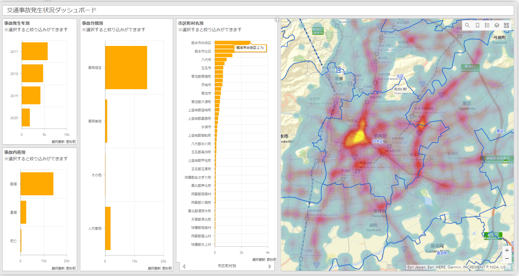 ①交通事故発生状況ダッシュボード:交通事故の傾向を把握しやすいようにグラフと地図で事故状況を表示。