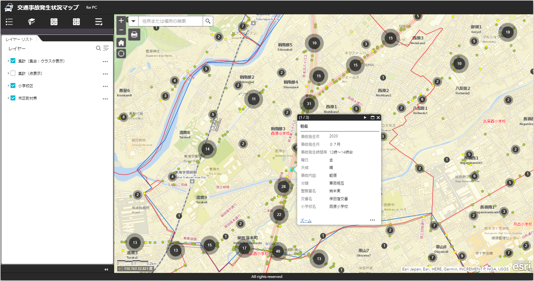 そこで、県内の交通事故情報を県民向けに公開する「交通事故発生状況マップ」を ArcGIS Online で構築し、2020 年 4 月より公開を開始した。