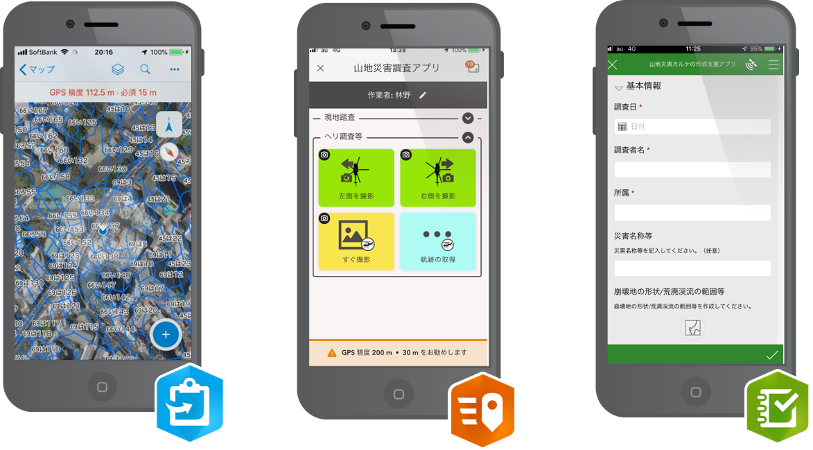 山地災害発生状況については、オフライン環境でも利用可能な複数の現地調査用モバイルアプリ(ArcGIS Collector、ArcGIS Survey123、ArcGIS QuickCapture)をベースに、作業目的に合わせたカスタマイズを行うことで対応することとした。