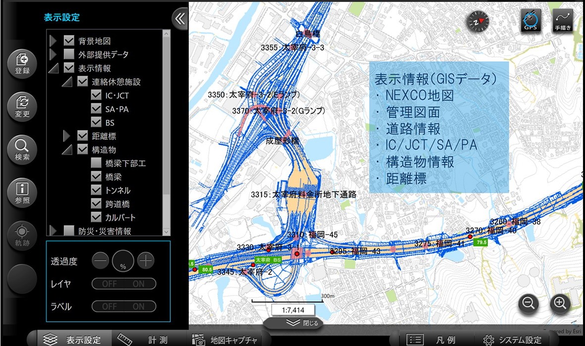 これらの要件を基本的な機能として満たしており、これまでも NEXCO エンジニアリング九州で開発・利用してきた現場業務支援ツール(eQ 野帳)にて採用された実績のある ArcGIS が本システムにおける地理情報対応の核として選定された。