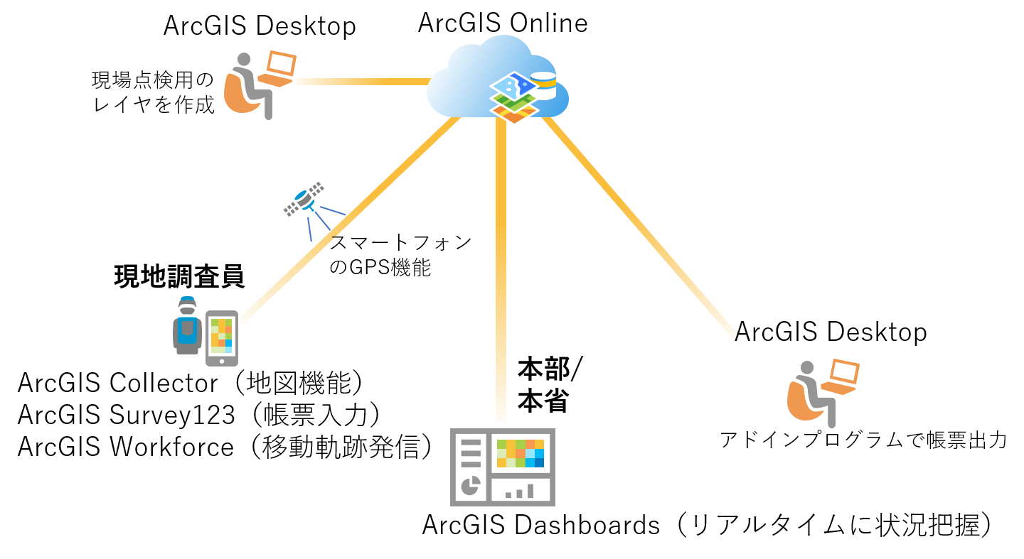 複数のサービスを比較検討した結果、ESRI ジャパンのビジネスパートナーである同社はまず、ArcGIS Online と付属する現地調査アプリを活用したシステムを提案することにした。開発を担当した同社の山野氏は「一から開発しない、保守・維持管理のコストを削減できる点が決め手になりました」と語る。