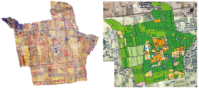 図5左は、文化10年(1813)作成の「勝浦郡樫原村分間絵図 控」(上勝町蔵)であり、現在の上勝町樫原地区を描いたものである。図5右は,絵図に記載された家屋や祠、堂宇、道、村界線をベクター化して、2000年撮影の空中写真と重ね合わせたもので、景観調査の基礎資料として利用した。分析の結果、棚田が広がる農村景観は、約200年前から長年維持されてきたことが証明された。その景観の文化的価値が評価されて、平成22年2月に国の文化財「重要文化的景観」(棚田景観)に選定された。