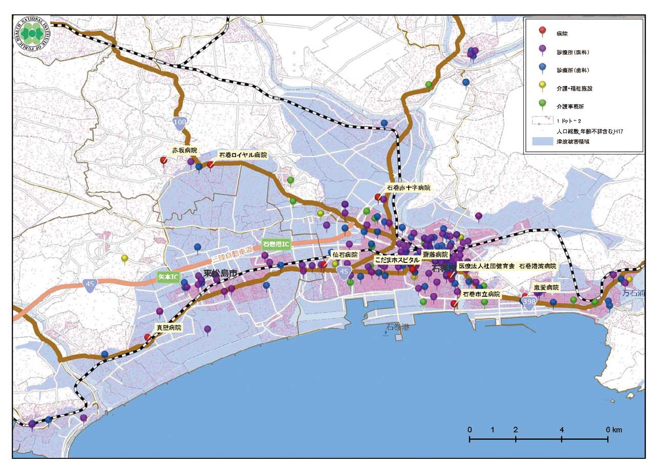 被災地では避難所等での生活が長期化し様々な健康への影響が懸念されていた。飲料水、食品、住環境などの確保の他、通院可能な病院確保が重要となった。さらに、今後の医療計画や地域連携の対応も検討されることになった。特に、原子力災害に伴う避難範囲を設定する上で、正確に医療機関等の位置情報の把握が求められたが、GISを用いることで的確な搬送指示ができた。