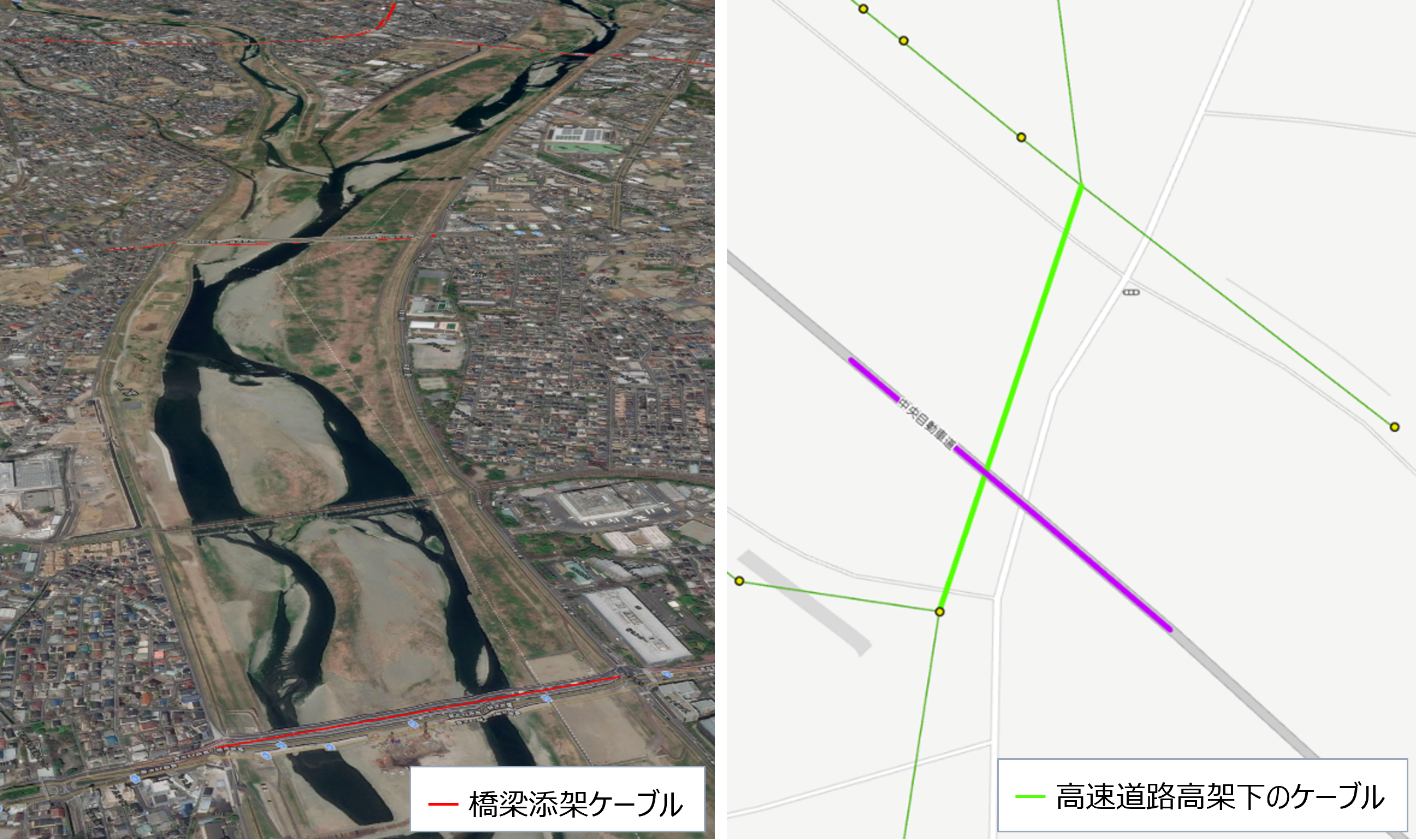 送配電線には、電力保安装置の制御を目的として通信ケーブルが併せて設置されている。こうしたケーブルが、河川や道路、鉄道軌道といった施設を縦横断する場合には、各施設の管理者に対して占有許可を申請する必要があり、またケーブルの脱落による災害を防止するため、ケーブル網の中でも特に留意する必要がある。従来はこうした縦横断については、現場や図面の上での目視確認に基づいたリスト化を行っていたが、ArcGIS Pro の空間結合機能を用いることで、網羅的な把握・リスト化を実現した(図 3)。