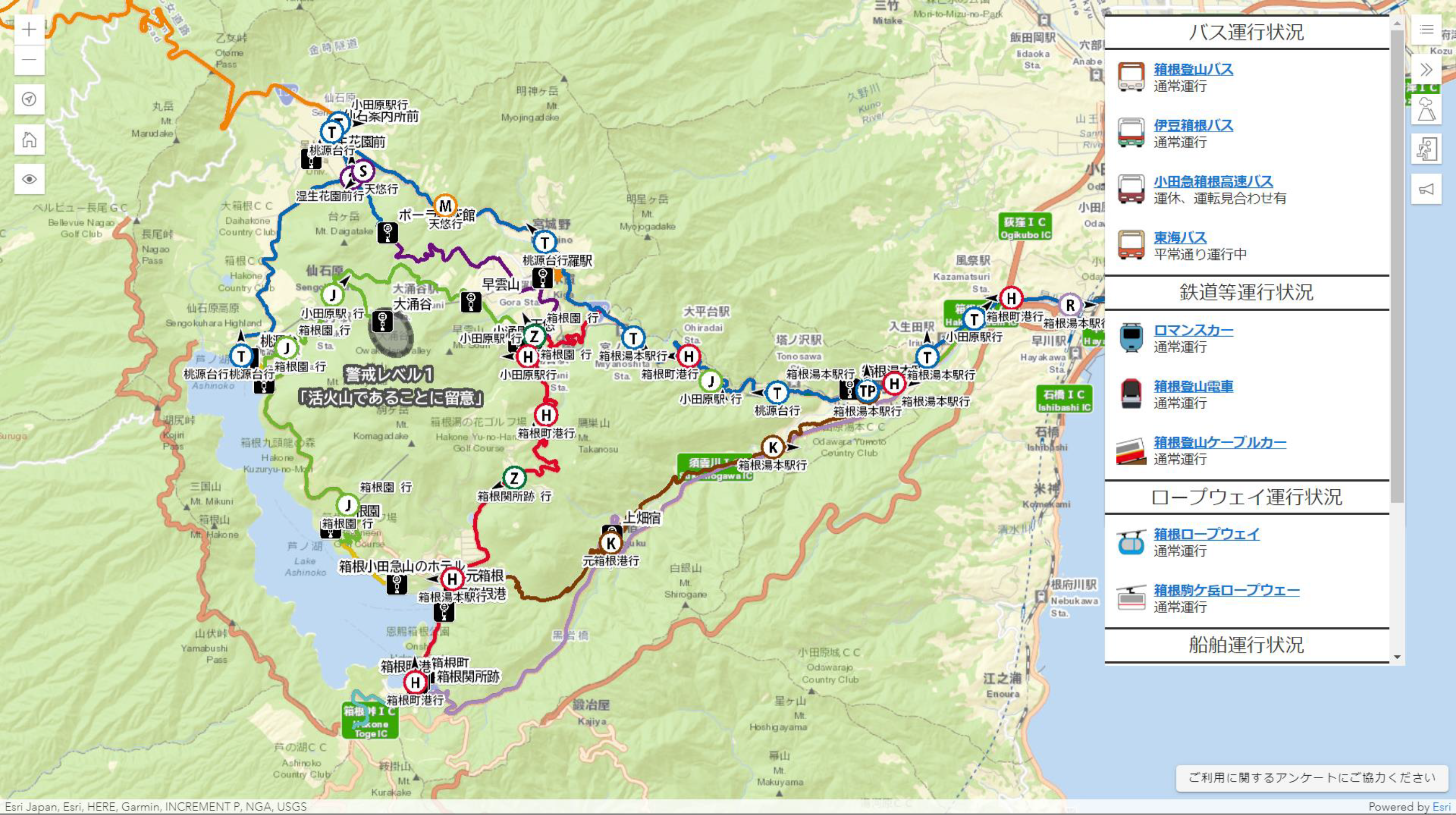 さまざまな交通機関の情報を一元化して掲載し、町内を運行するバスのリアルタイムな現在地情報を提供することで、住民や観光客の交通利便性の向上を図った。災害発生時は避難所の開設状況をマップに掲載し、町民だけでなく観光客にも公開することにより、安心・安全な観光地としての PR 効果も期待できる。また、情報提供によるさまざまな公共交通機関の利用促進により移動手段を分散化し、渋滞緩和、コロナ禍での密回避にも貢献している。自治体が発信する安心・安全に関する情報や、地域内に存在する複数の交通事業者の運行情報を、ArcGIS Enterprise に集約し、ArcGIS Online を利用したアプリを公開することで、地域内住民だけでなく、地域を来訪する人にとっても、有益な情報を直感的に取得できる手法を開発した。今後は他地域への展開を予定している。