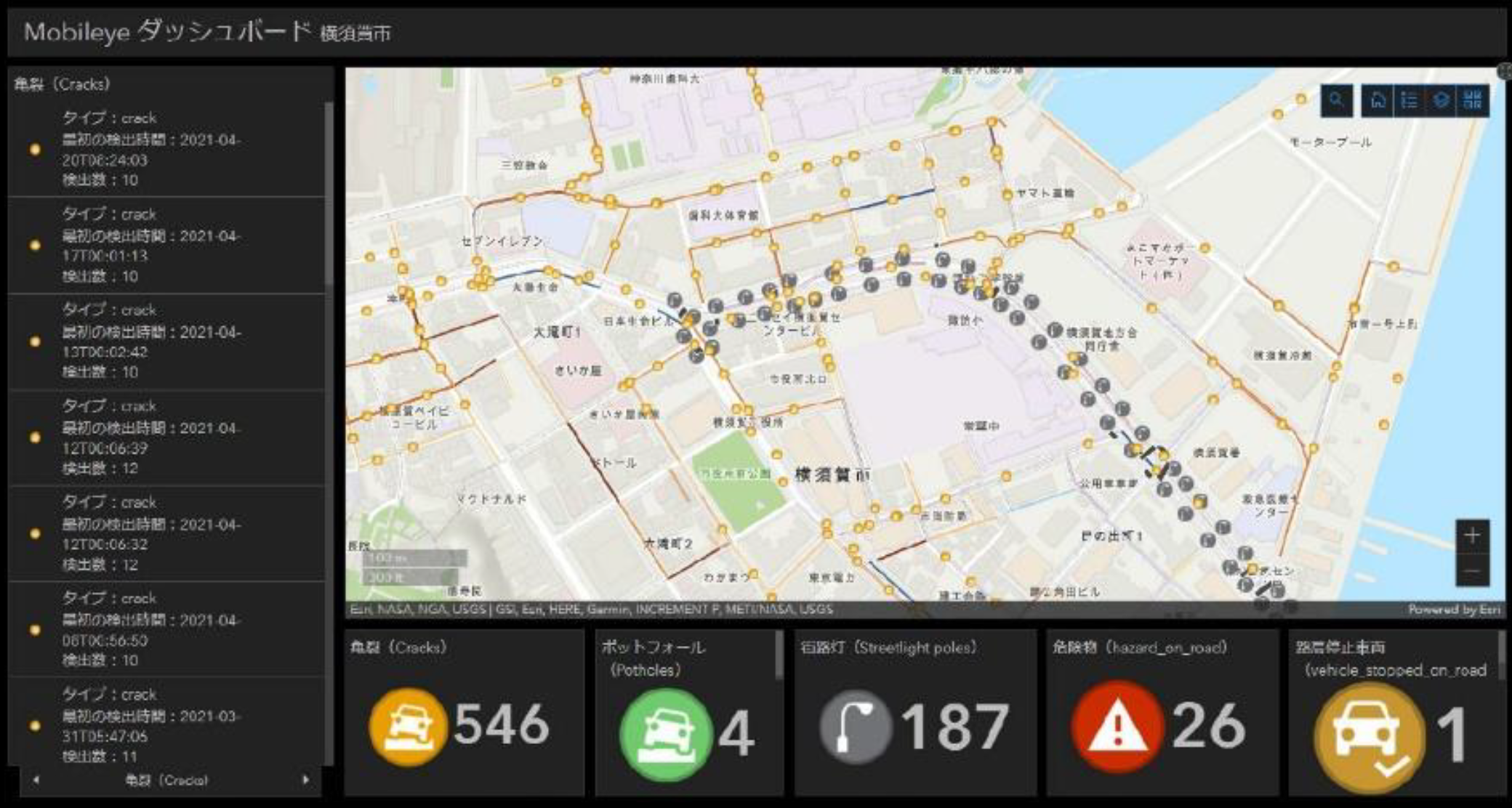 道路維持管理システムの対地域展開を目的に、横須賀市、(株)モービルアイジャパン、丸紅(株)、ESRIジャパン(株)と連携して、横須賀市が主導している「ヨコスカ×スマートモビリティ・チャレンジ事業」の一環として、車載型エッジ AI を活用した沿道状況センシングシステムの開発に着手した。本取り組みでは、路面状況等の道路資産に関するデータを取得するだけでなく、歩行者や自転車の位置・通行量に関するデータを車載センサーによって連続的に収集・蓄積し、得られるデータと他の既存データを重ね合わせ、道路の通行安全性を多角的に評価した。