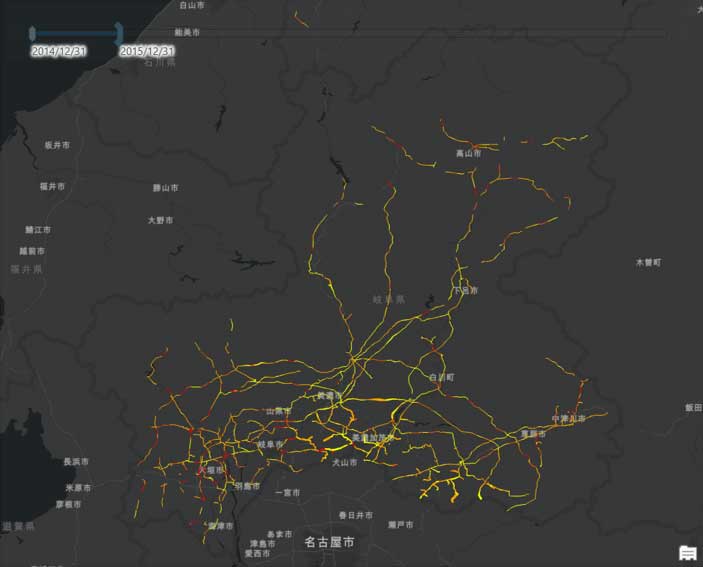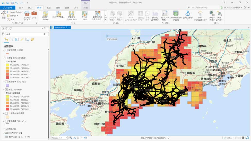 中部電力では、高精度に落雷情報を取得するための研究を従来から進めてきた。落雷位置の標定精度や、落雷の特徴を解析するシステム の能力が向上し、より精密で詳細な落雷の地理情報を得ることができるようになった。こうした最新の落雷情報と送電設備情報を ArcGIS Pro 上で解析することにより、設備単位での落雷発生確率を解析することが可能となる。また、地図上で可視化することで、直感的に地域ごとの落雷の特徴やトレンドを把握することができるようになる。解析業務は ESRIジャパンのコンサルティングサービスを活用し、ESRIジャパンと共同で進めた。まず、送電鉄塔、送電線、落雷対策設備の位置情報を基に ArcGIS Pro 上にプロットした。これらの設備情報に、中部電力の保有する落雷情報を重ねてプロットした。落雷情報は時刻データを有するため、時間経過による落雷地点の推移を表現することもできる。(図1)