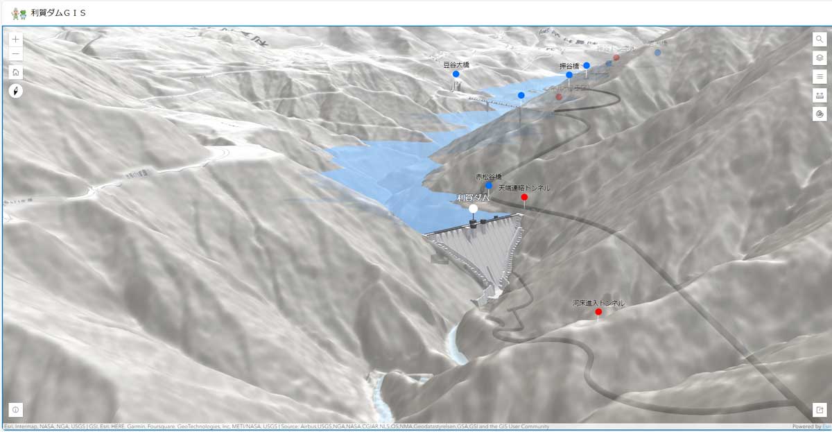 ダム事業において関係者が現場の状況を把握するには、現場ごとの作業進捗データが確認できることが必要不可欠である。これらのデータを GIS の地図上にプロットすることで、効率的な意思決定につなげることができる。国土交通省全体においても、インフラ事業の DX 化や現場の人手不足を補うため、GIS の活用が注目されている。JACIC では、既に持っているデータとの親和性の高さと操作性の良さなどから ArcGIS の導入を決めた。そのうえ、インターネット環境下であればハイスペックな PC でなくても 3 次元統合モデルなどを表示でき、だれでも利用できる手軽さも導入の決め手となった。