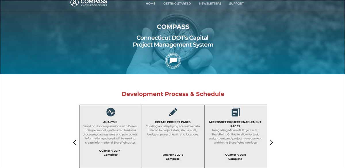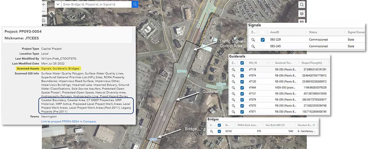 CTDOT では、約 700 の進行中のプロジェクトを管理しており、そのうち約 150 が建設フェーズに進んでいる。プロジェクトの資産情報から許可申請などのドキュメントの各種データは ArcGIS と Microsoft 製品で構築された COMPASS というデータ統合システムで管理している。