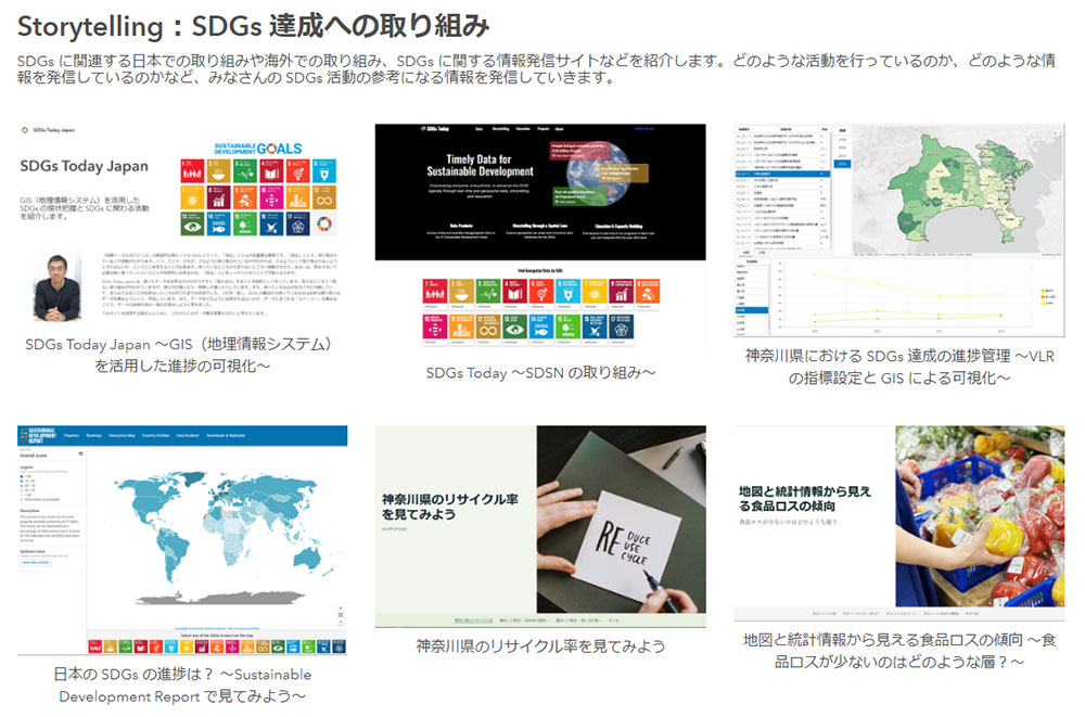 SDGs Today Japan では、主に日本の SDGs の進捗に焦点を当て、各組織が取り組んでいる SDGs の進捗状況・達成度について GIS を用いて可視化した事例を紹介し、SDGs に関わる人々が現状を把握できる情報を発信することを目指している。掲載する情報コンテンツについては、「現状の把握」と「Storytelling」の 2 つのカテゴリで整備を行った。