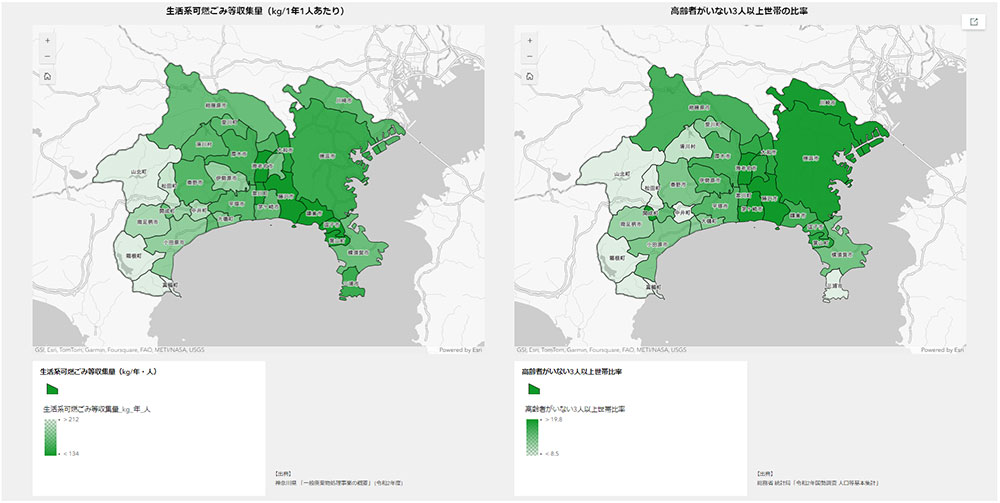 具体例としては、神奈川県 SDGs 指標候補を地図で可視化したダッシュボードを、ArcGIS Dashboards で作成した。このダッシュボードでは、指標と年度を選択することで、対象年の数値を市町村または市区町村ごとに地図上で色分け表示でき、指標の数値の経年変化をグラフで確認することもできる。