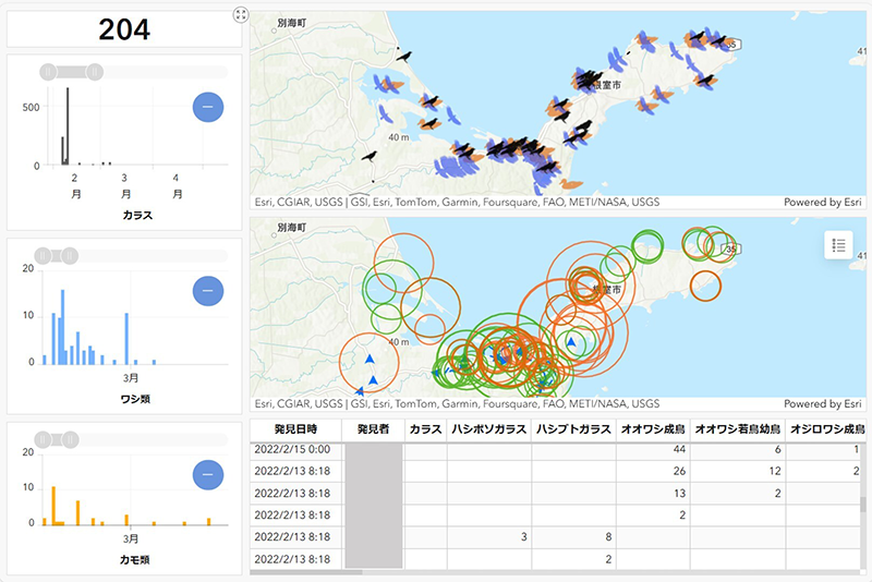 調査結果として蓄積された約 40 種の鳥類を、ArcGIS Dashboards を用いて“ワシ類などの希少鳥類”と“カラス・カモ類などの一般鳥類”に分類し可視化した。