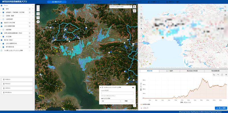 九州電力株式会社の土木建築技術センターは、近年、業務の DX 化に力を入れている。特に「2D・3D マップとデータベースを活用した設備情報の管理・活用の高度化」に注力し、ArcGIS を活用している。設備情報の見える化として、既存データにさまざまなデータを重ねたマップやアプリを作成し、2023 年(令和 5 年)度に整備した非常災害対応アプリは、気象・災害状況のモニタリングや現地被害状況の効率的な情報収集への活用が期待され、2024 年(令和 6 年)6 月より現場(支店)に試行導入された。今後は GIS のさらなる活用と外部展開を目指している。