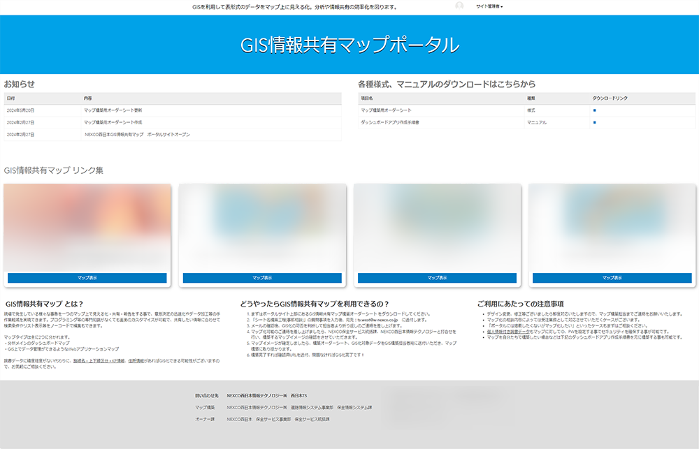 各業務に対応した GIS 情報共有マップが複数リリースできた段階で、ArcGIS Enterprise Sites を用いて「GIS 情報共有マップポータル」を開発した。ArcGIS Enterprise Sites を用いることで業務ポータルサイトのトップページやカテゴリページをブログ感覚で作成・編集することができた。