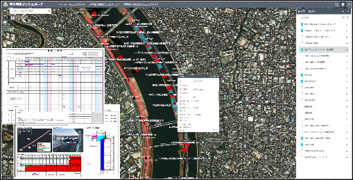 地図を活用した情報の閲覧や編集機能を備えた柔軟なアプリ構築ができる ArcGIS Web AppBuilder を用いて荒川デジタル河川管内図上で「河川管理ダッシュボード」を構築し、一時使用情報や、隣接する工事情報などの各種デジタル情報を一元的に管理、閲覧可能とした。これにより工事発注者と受注者間の情報共有が容易となり、業務効率が飛躍的に向上した。また、今まで対面で開催していた工事工程会議を Web 開催に切り替えて河川管理ダッシュボード上に会議資料を保存することにより、「いつでも」「どこでも」事業調整を可能としたほか、ペーパーレス化も実現している。